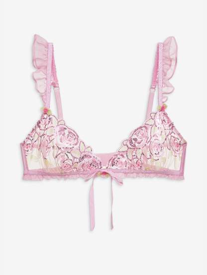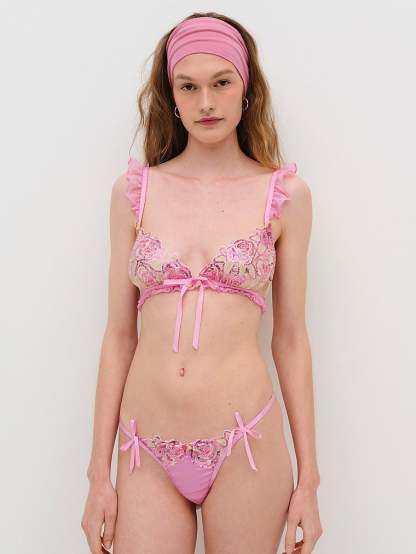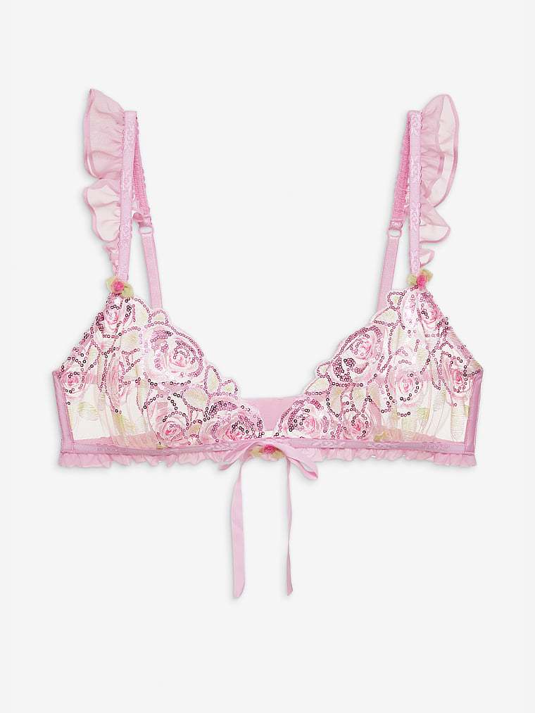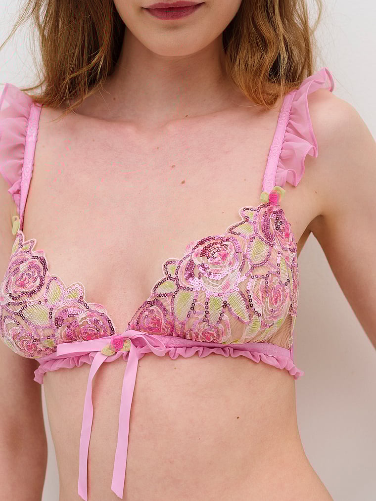 This oh-so-romantic wireless style offers feminine touches with decorative rose elastic and organza rosettes with chiffon ruffles. Pair it with the Doreen Thong Panty for a matching set.