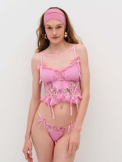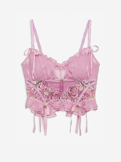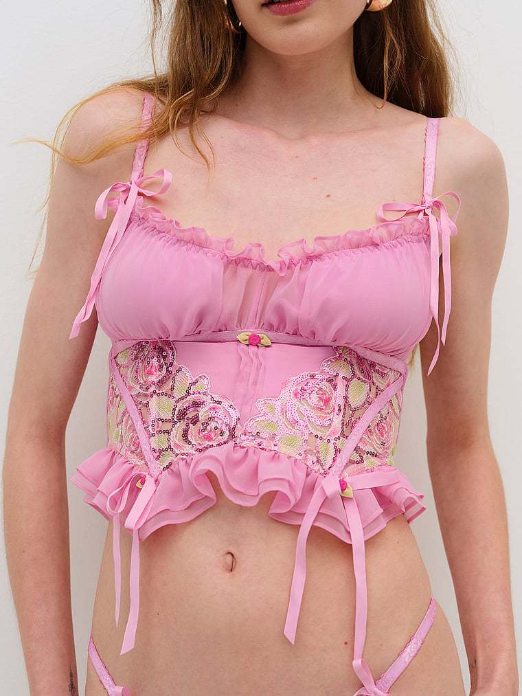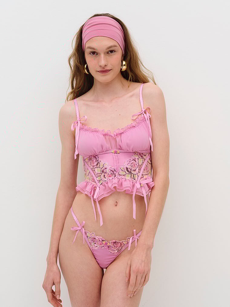 This oh-so-romantic bustier offers feminine touches with a ruched chiffon bust panel, organza sequin-trimmed rosettes, and ribbon bows. Pair it with the Doreen Thong Panty for a matching set.