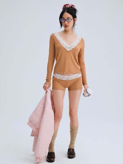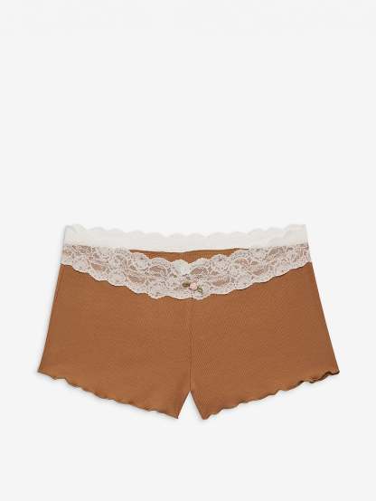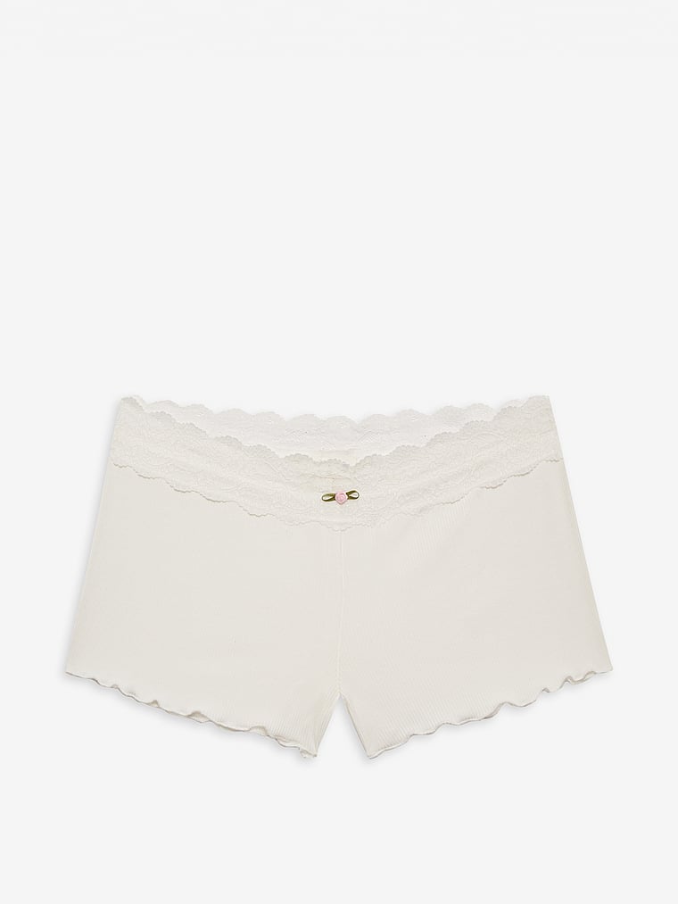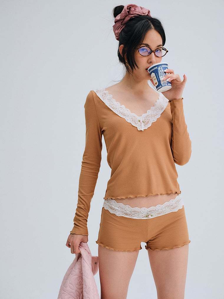 These lounge shorts feature a lace trim at the waistband decorated with a small rosette, plus lettuce edge finishes at the legs. Pair it with the Eisley Ribbed Knit Top for a complete cozy look.
