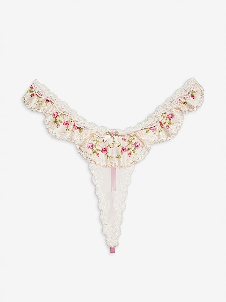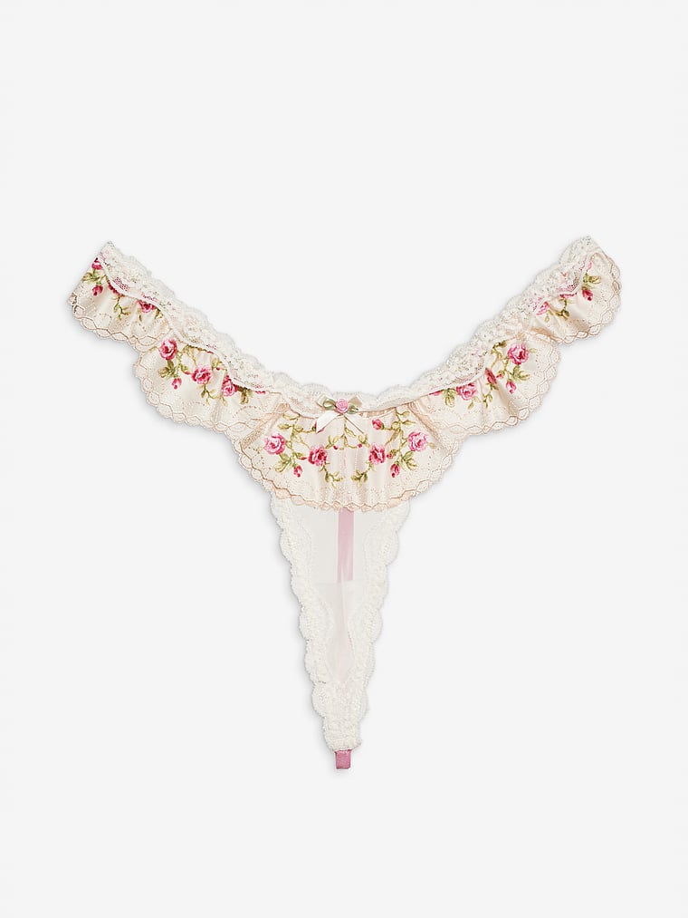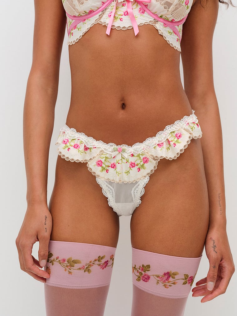 Lacy trim and floral rosettes? How romantic! This G-string thong has both, making it a must for big nights in. Pair it with the Gretchen Underwire Bra for a complete set.