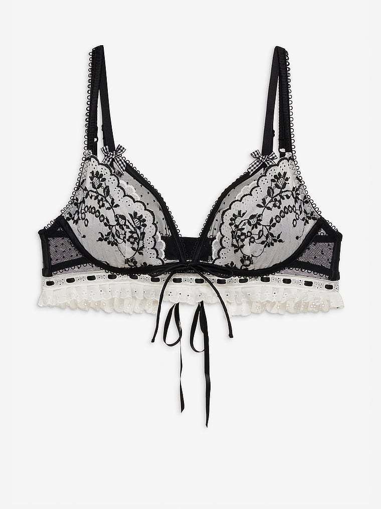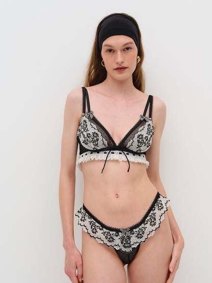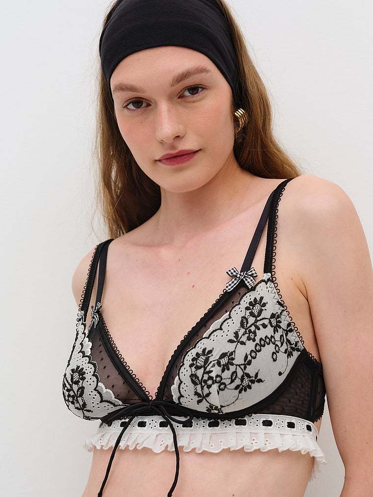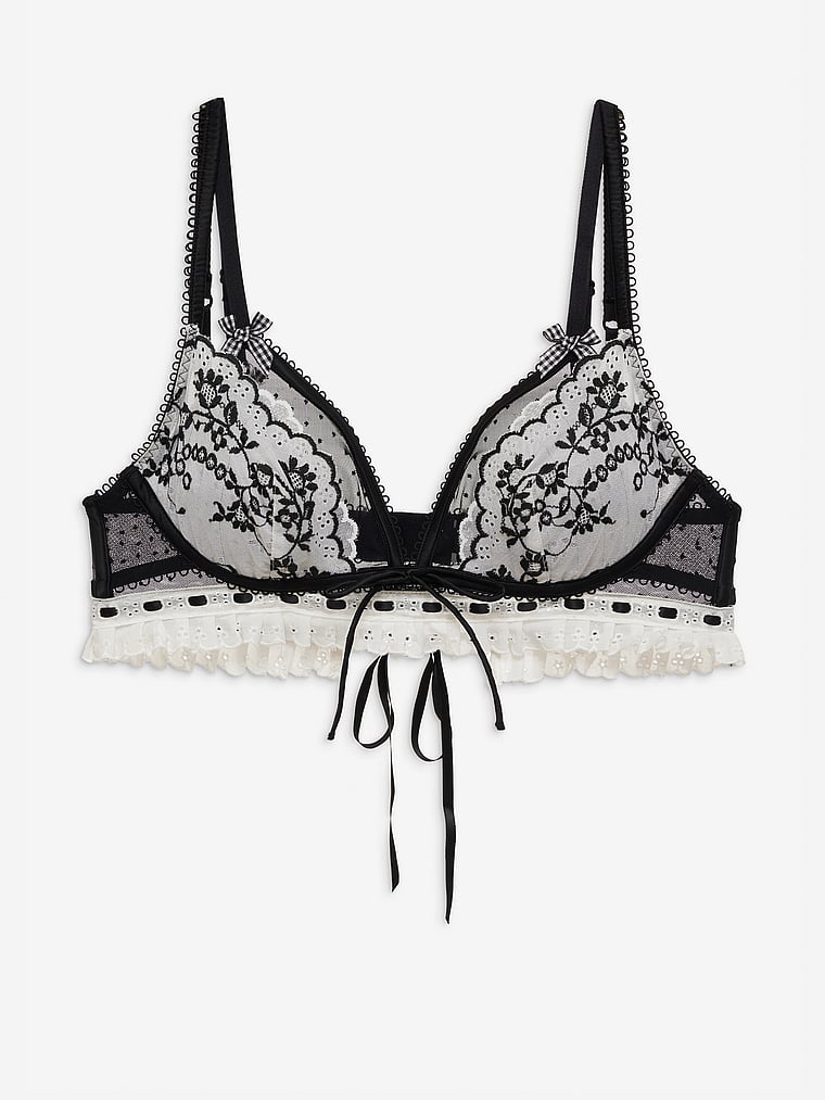 Inspired by sultry French lingerie, this bralette offers double-layered lace and dot mesh details with ribbon eyelet trim and gingham bows. Style it with the matching Rubee Thong Panty and Garter belt for the full set.