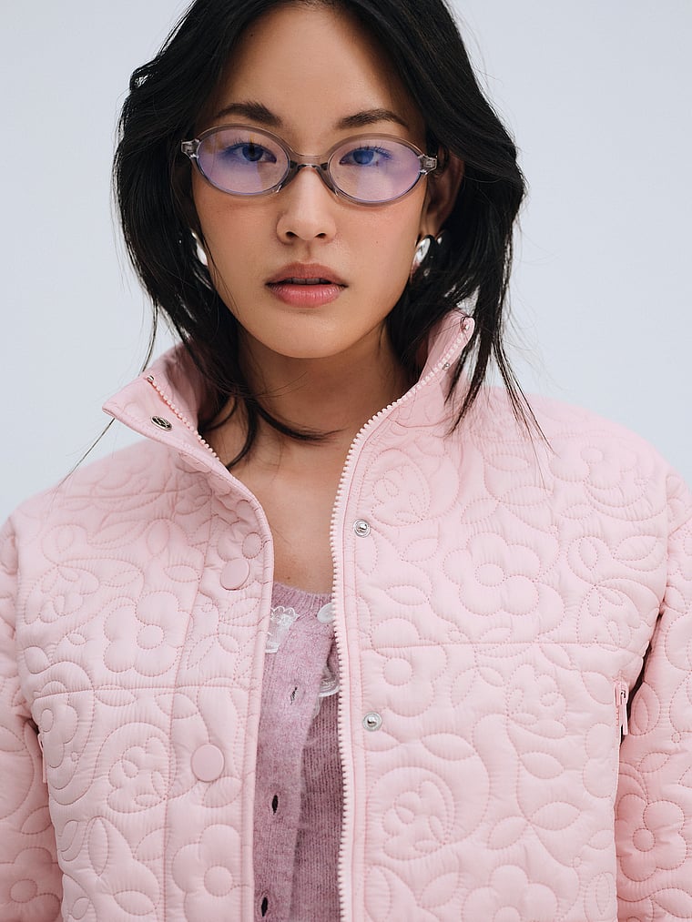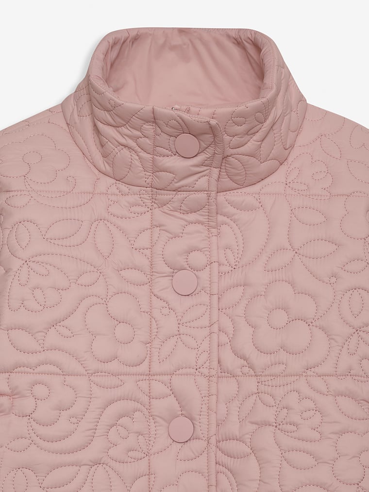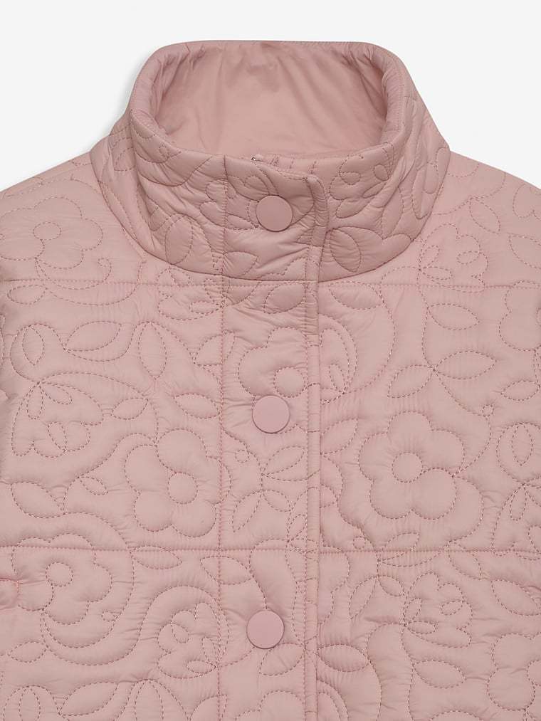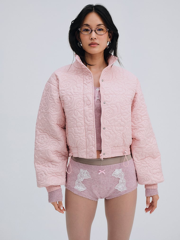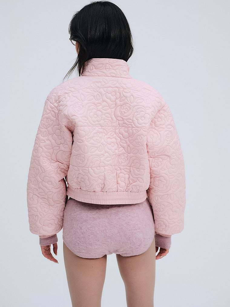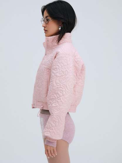 This cropped puffer jacket crafted in a quilted floral fabric is finished with ribbed cuffs, a stand collar, and snap buttons for a utilitarian, wear-everyday look. It's your perfect on and off-the-clock outerwear piece. We recommend getting your usual size for the best relaxed fit.