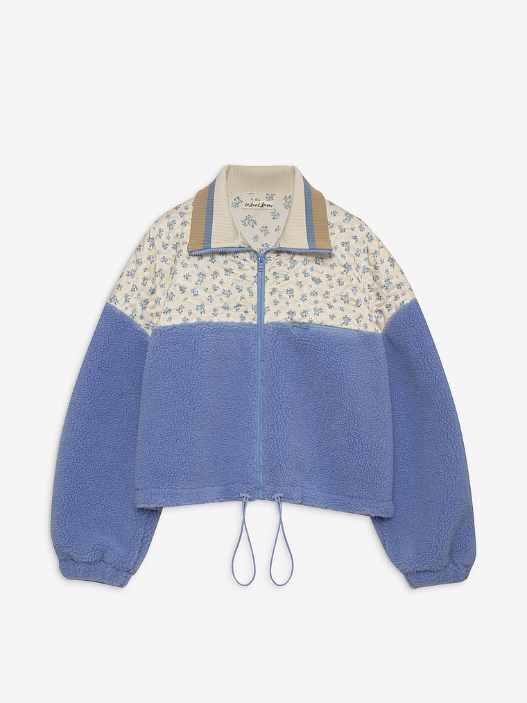 Crafted in a quilted floral with contrast blue fleece, this oversized style spotlights a contrast ribbed collar, a functional front zipper, and a front chest welt pocket. Call it your go-to cozy style for fall. We recommend getting your usual size for the best oversized fit.
