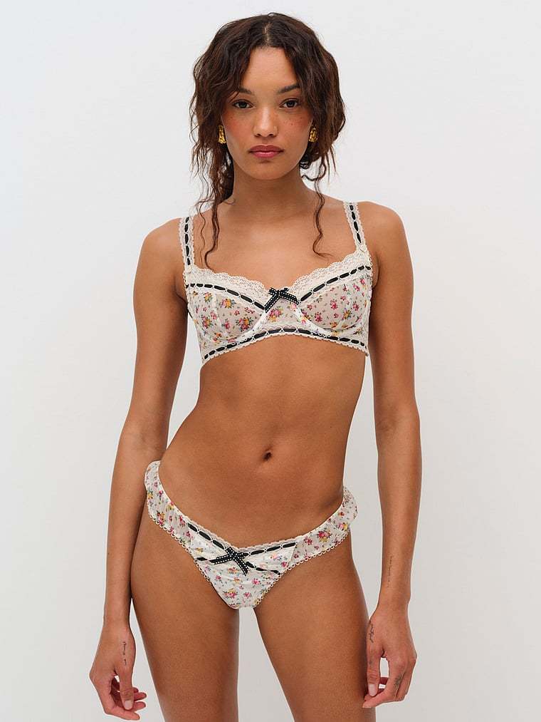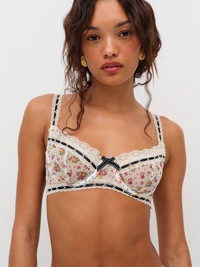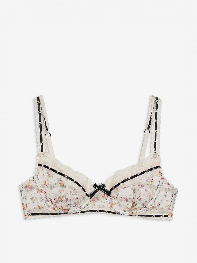 An allover floral print with black contrast velvet trim makes this underwire bra both sweet and sexy. Fluttery and feminine, it has adjustable straps and a bow at the front, too.