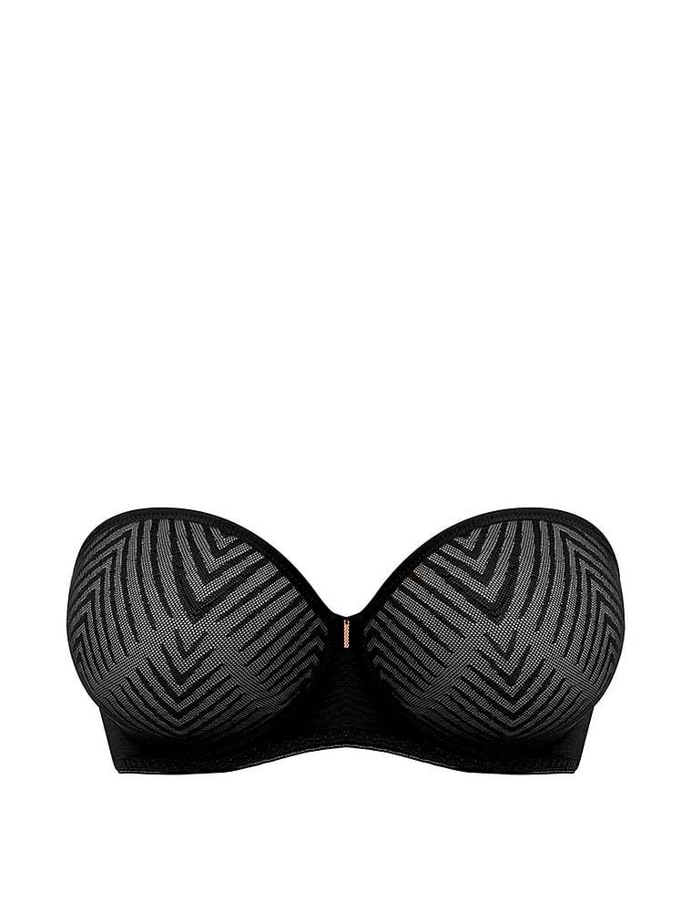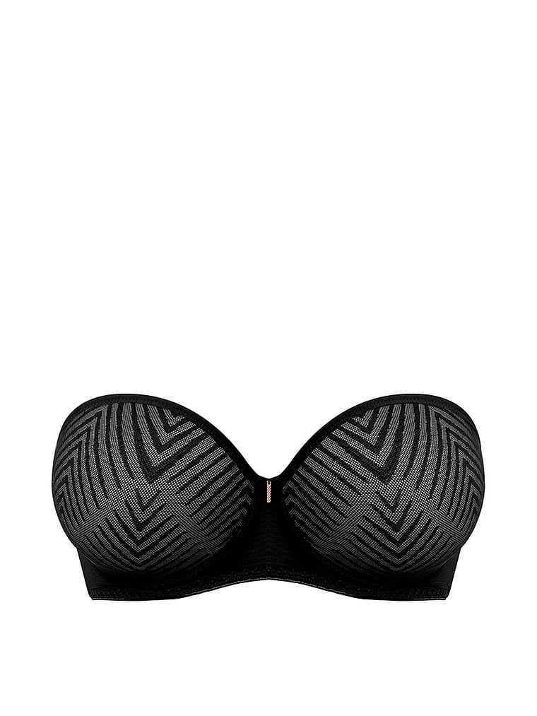 Fashionable geometric lace updates this strapless, supportive style. Convertible, removable straps and soft molded cups add versatility and comfort.