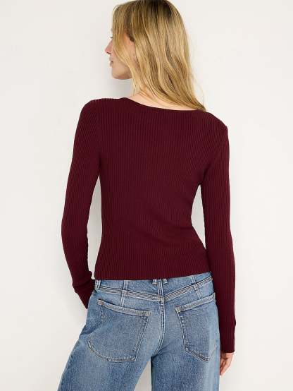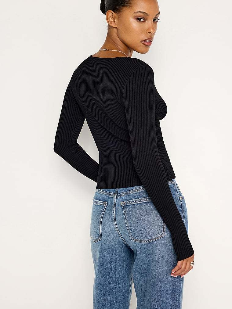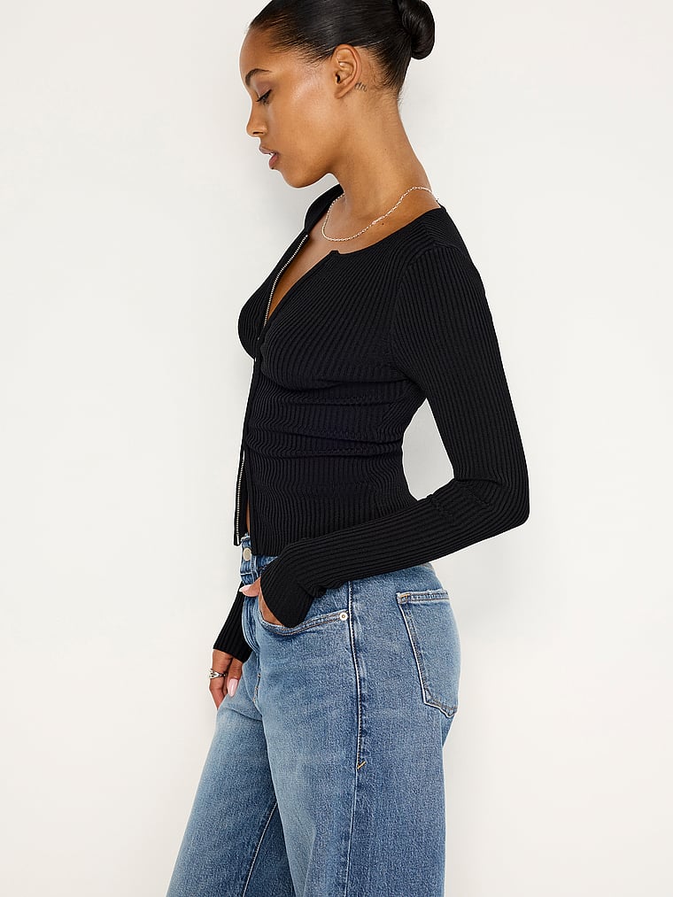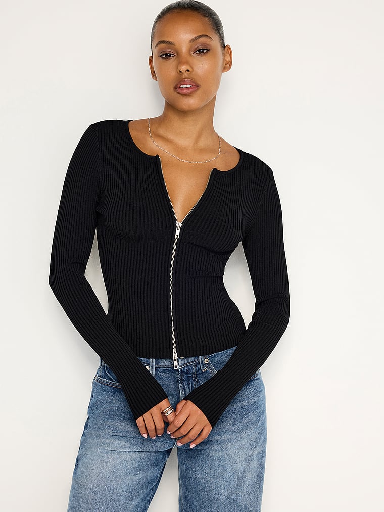 Stretchy ribbed fabric lets you stay warm and look hot in this slim sweater. It features a two-way front zipper so you can decide how much skin you want to show.