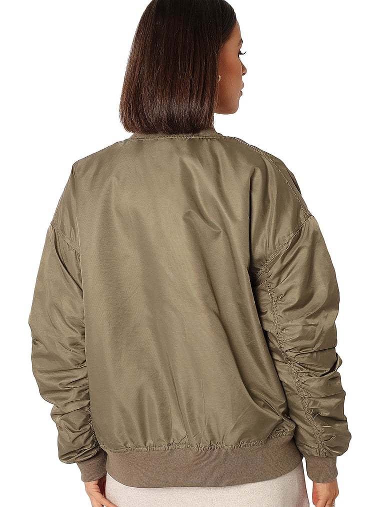 Featuring a classic baseball collar and long sleeves with ribbed cuffs and gathered detailing, this bomber-style jacket plays nice with all your favorite jeans, tees, and more.