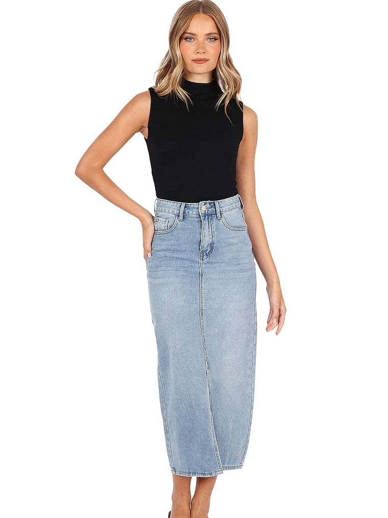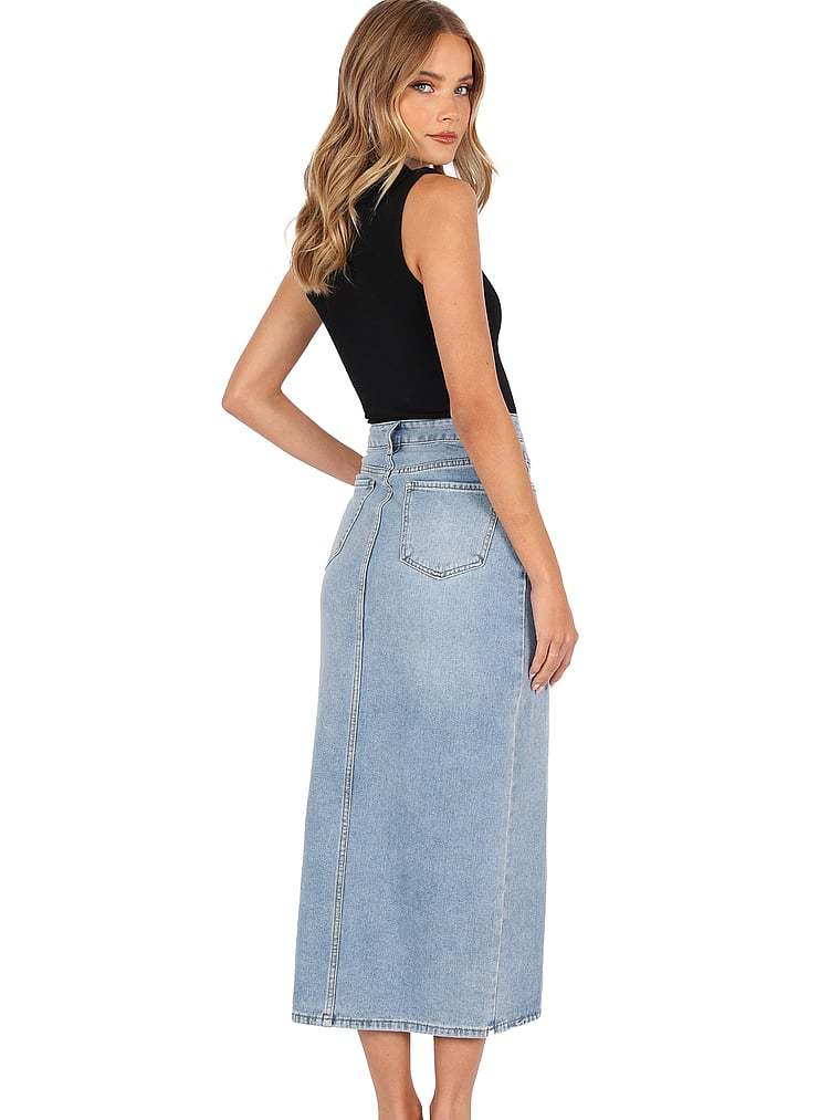Whether it's for work or play, you can be sure to look your best in this midi length denim skirt featuring a flirty front split.