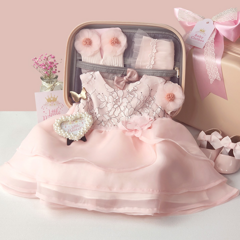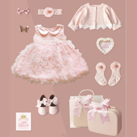Hello, little princess! Here's a beautiful gift for you. This newborn baby gift set is perfect for all baby girls. It has all the essential pieces inside the multifunctional suitcase. In addition, it features a beautiful pink outfit/dress for the baby girl, socks, shoes, ponytails, and a cute photo frame. Sure to make your memories of your baby's first outfit most remarkable. Perfect for baby shower gifts to a newborn baby, birthdays, or any other special occasion. A must-have set for all little princesses!