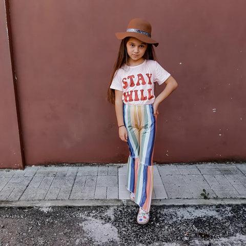 Bring it back the retro vibes. Let your kids wear this stylish outfit that features a statement shirt and colorful vertical stripes with flare style at the bottom. It has retro-inspired because of its pants style. It is made of cotton and lightweight material. Perfect for any party or even casual occasion. Let your kids feel the retro-modern vibes on the groove. Add a chic ankle bootie and a wool coat for a winter-approved ensemble.