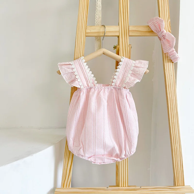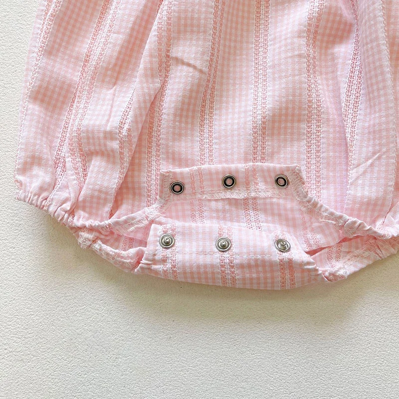 This gorgeous floral embroidered baby romper features a pink checkered print, ruffled sleeves with embroidered detail. This romper also comes with a matching headband. Perfect for your lovely little ones especially during the summer.