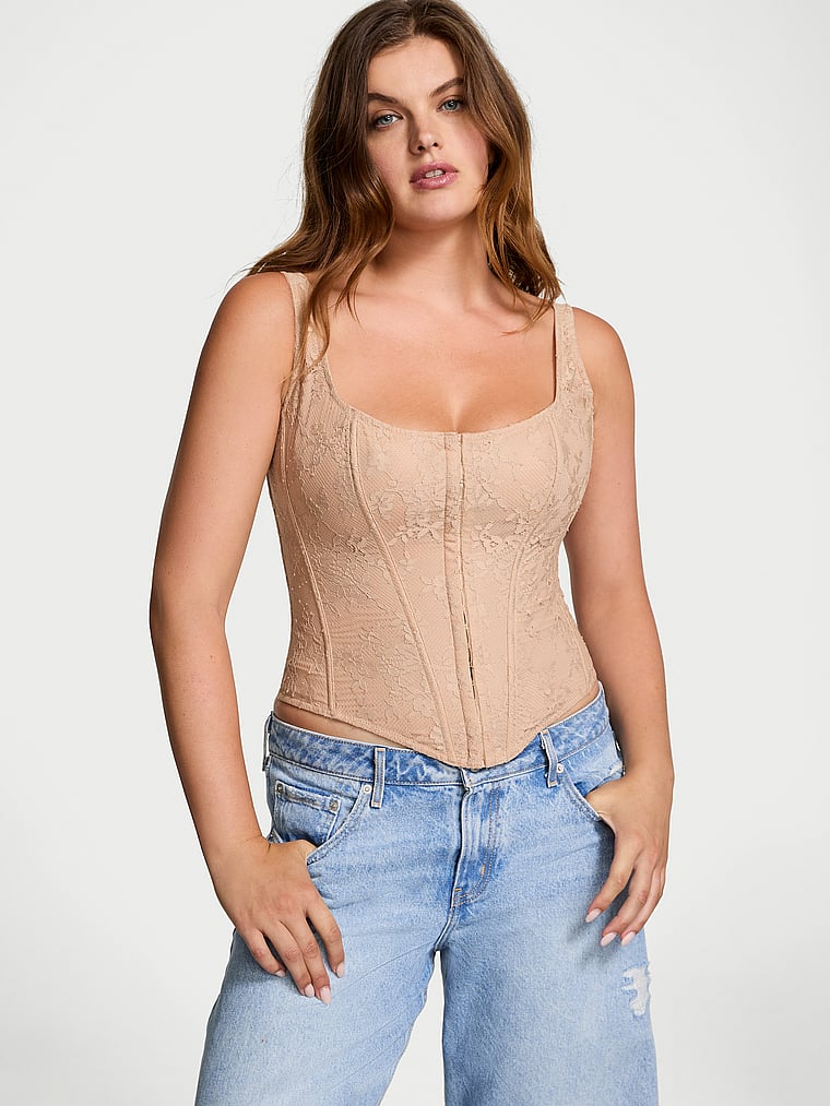 Inspired by the iconic original, this sexy set is crafted in our luxe, new lace with eyelash trim for a truly feminine feel. Classic styling includes boning throughout, front hook-and-eye closures, and an adjustable lace-up detail in back.