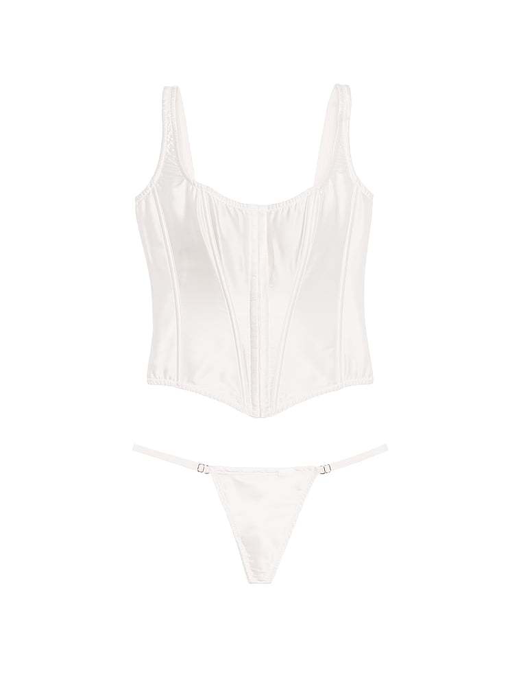 Inspired by the iconic original, this sexy set is crafted in sumptuous silk for an ultra-luxurious look and feel. Classic styling includes boning throughout, front hook-and-eye closures, and an adjustable lace-up detail in back.