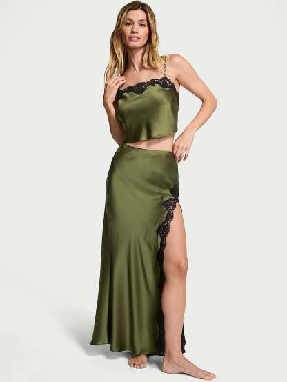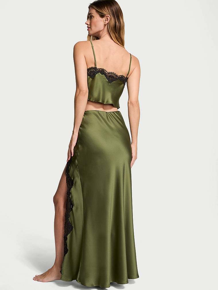 Going somewhere? Slip into something a little more fabulous with this two-piece stunner. Crafted in silky satin with contrasting lace, the cami top features a cropped silhouette and the streamlined skirt showcases a thigh-high slit.
