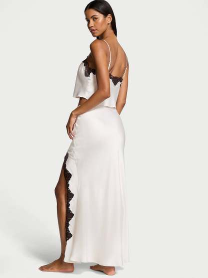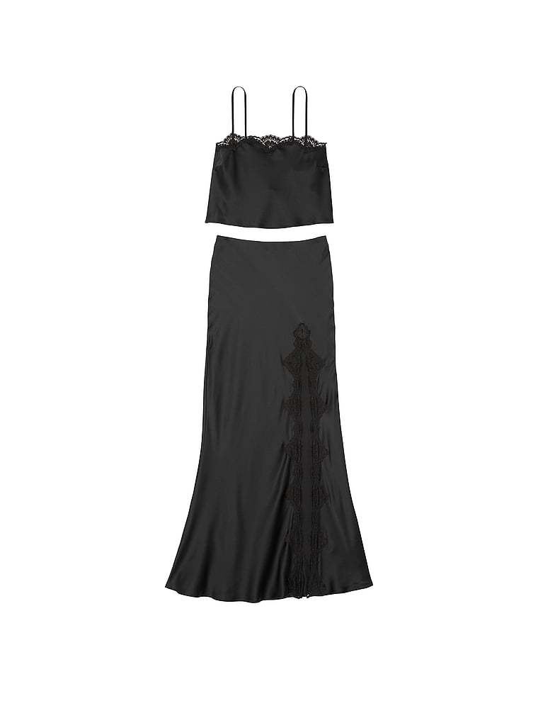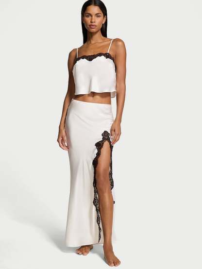 Going somewhere? Slip into something a little more fabulous with this two-piece stunner. Crafted in silky satin with contrasting lace, the cami top features a cropped silhouette and the streamlined skirt showcases a thigh-high slit.