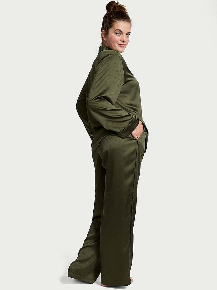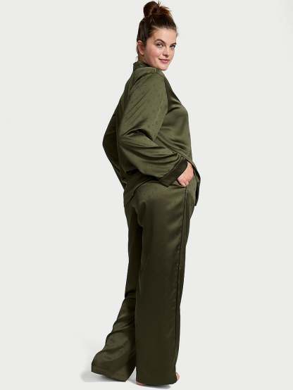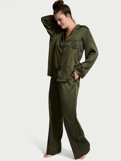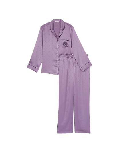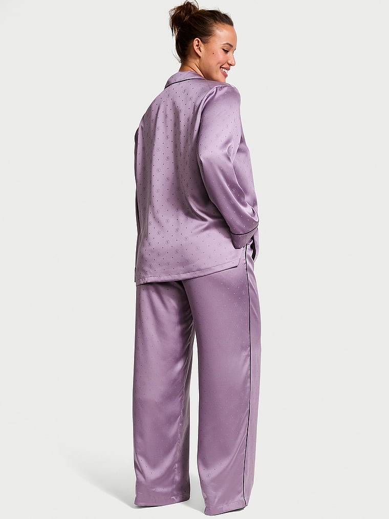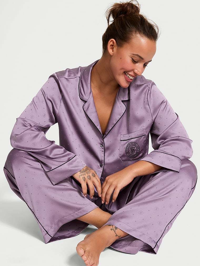 Now entering sleep mode. Wind down in this satin pant and matching long-sleeve top, dotted with our subtle logo design. Finished with a chest pocket, notch collar, and decorative piping.