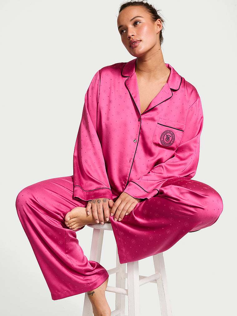 Now entering sleep mode. Wind down in this satin pant and matching long-sleeve top, dotted with our subtle logo design. Finished with a chest pocket, notch collar, and decorative piping.