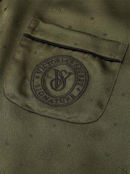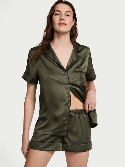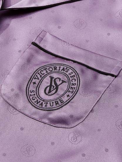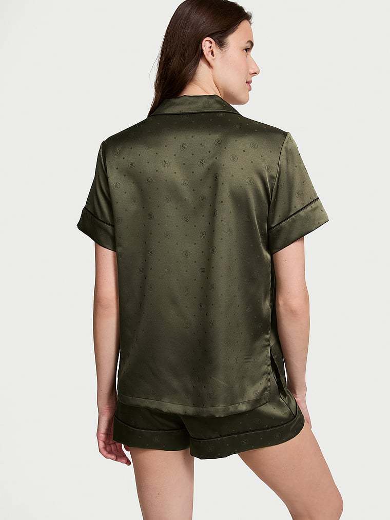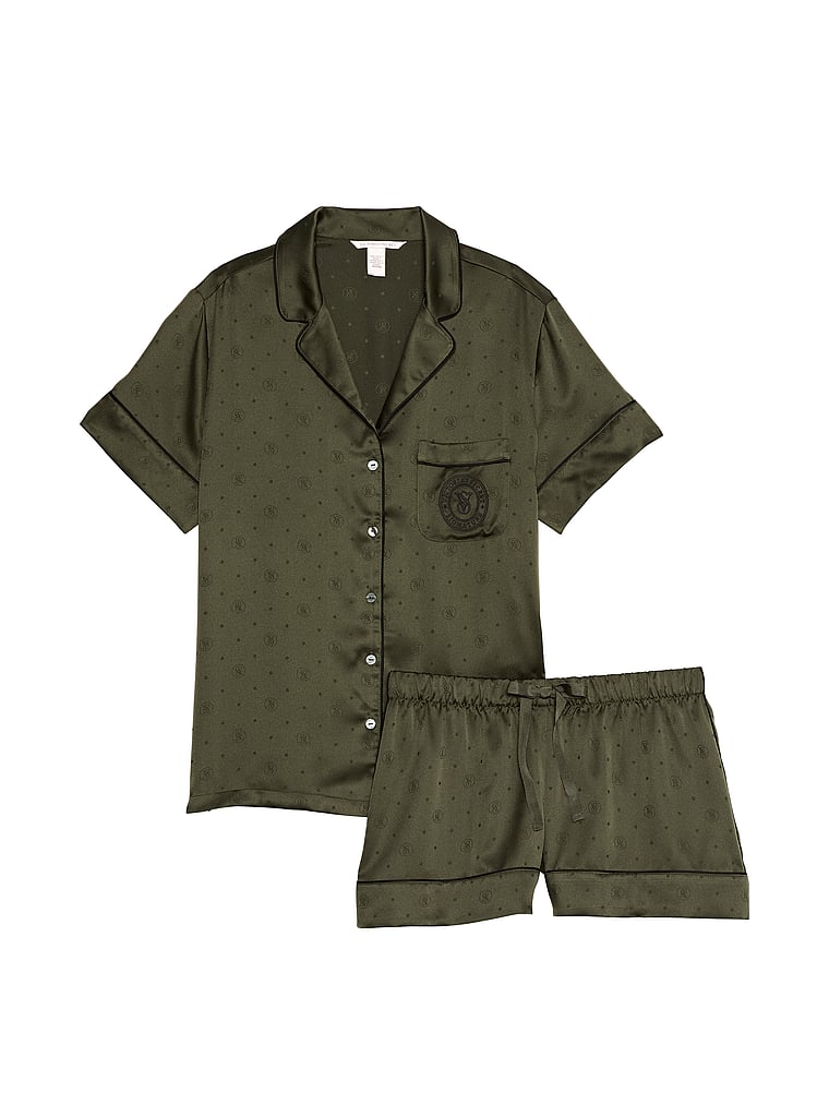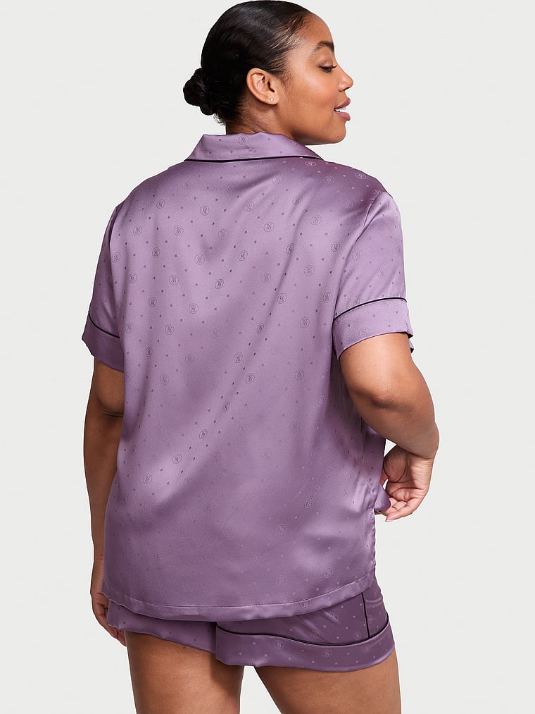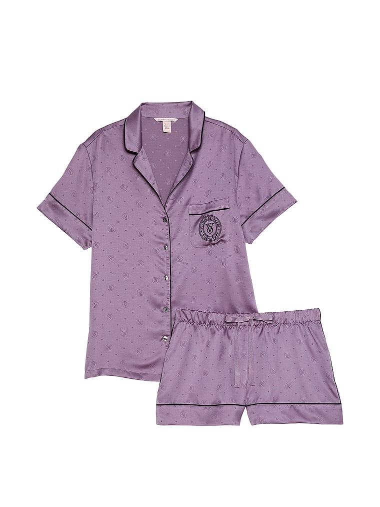 Get your beauty sleep in our glossy, logo-dotted set featuring a short-sleeve button-up and matching shorts. Finished with a chest pocket, notch collar, and decorative piping.