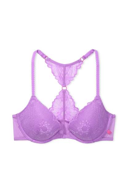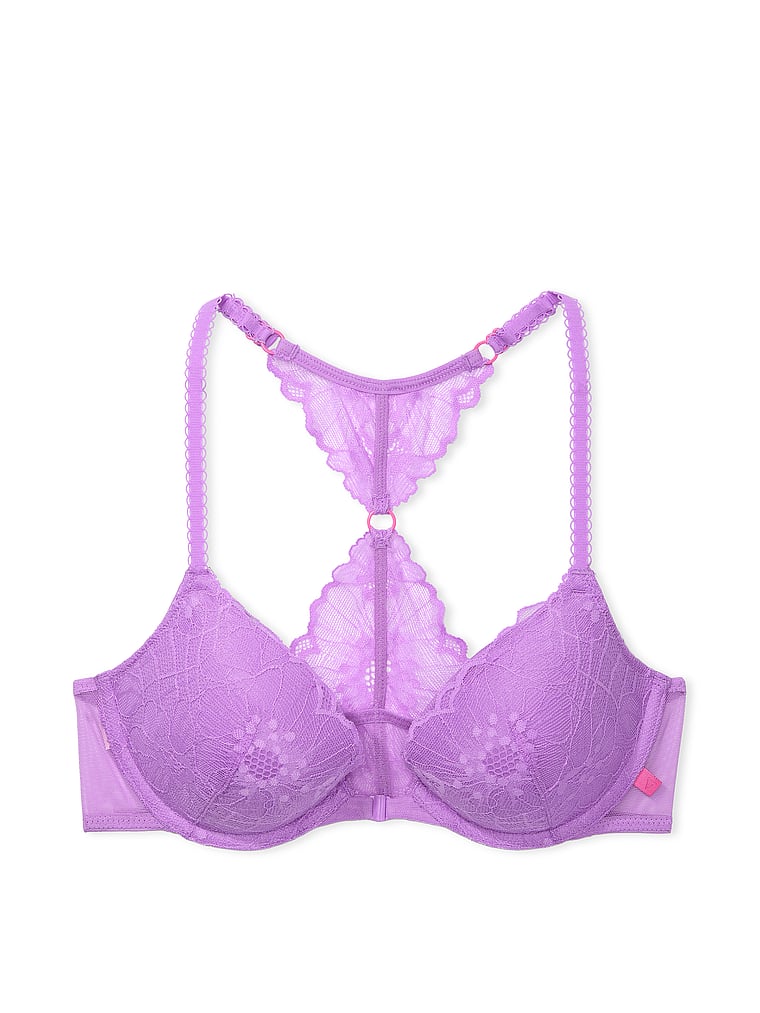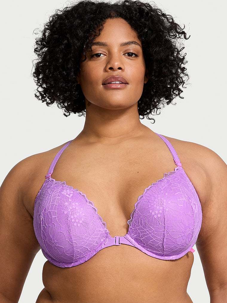 Our Flower Power Lace adds a femme touch to this front-close, racerback style. Showcased on a plushy, padded push-up bra that gives you shape and comfortable support.